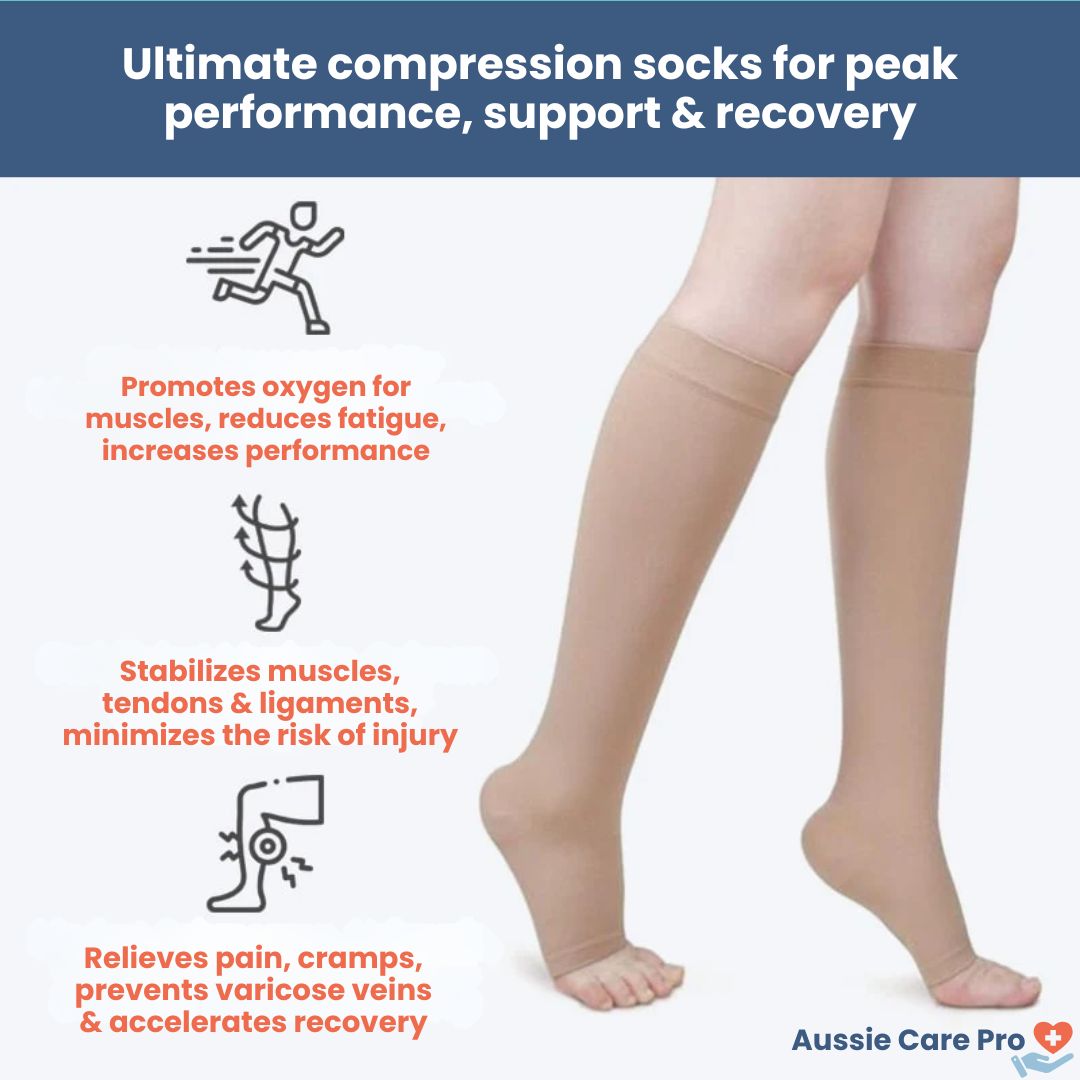 Say goodbye to leg fatigue and discomfort with Aussie Care Pro Compression Socks. Designed with 20-30 mmHg graduated compression, these open-toe socks improve circulation, reduce swelling, and provide targeted muscle support—perfect for long workdays, travel, or sports recovery.