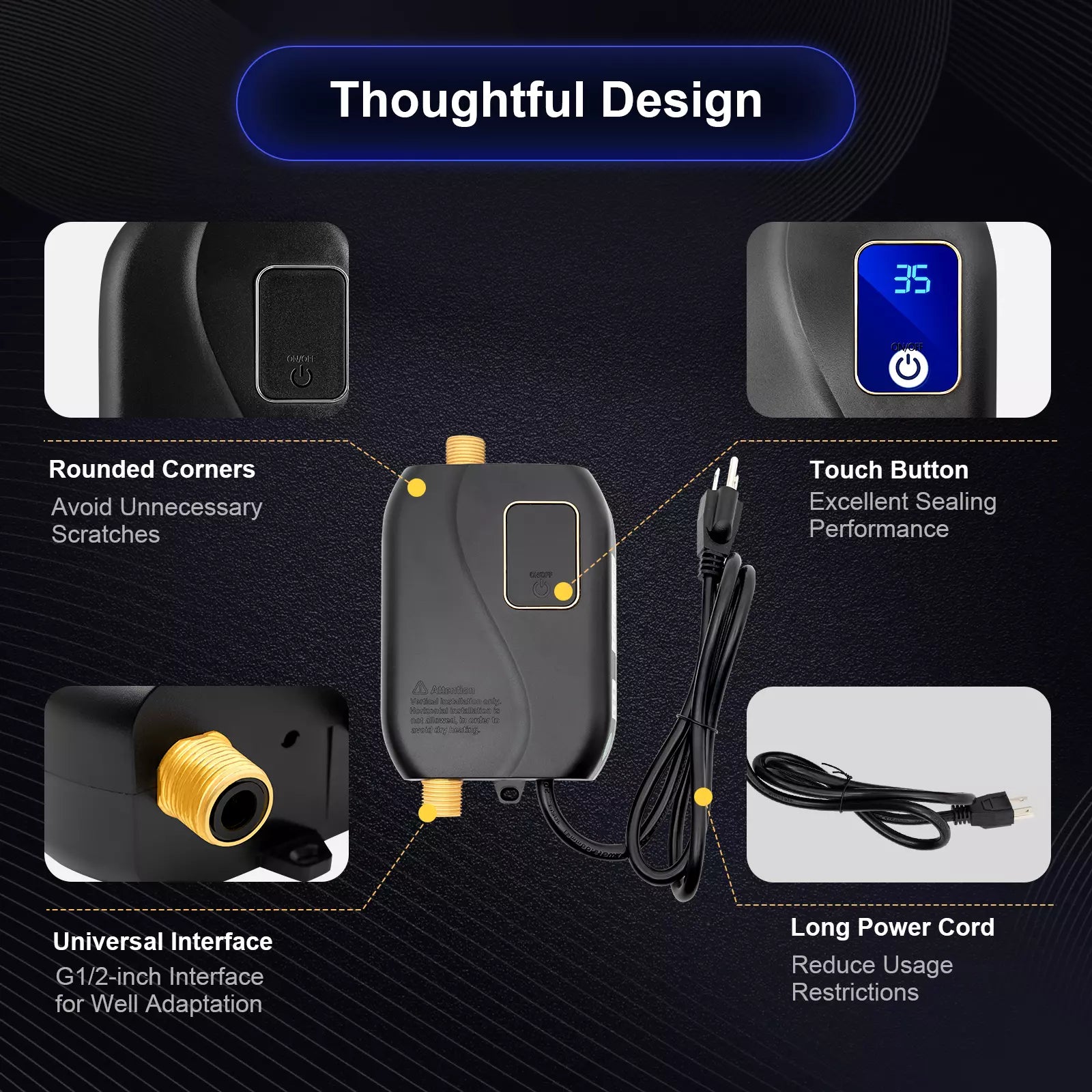 ✔ Smart Control: LED display with °C/°F options, real-time readings, and automatic flow-based temperature adjustments.