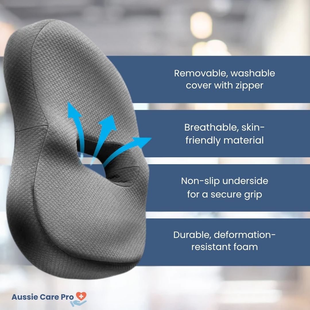 The central hollow design allows airflow and reduces pressure on your coccyx, making it ideal for those suffering from tailbone pain, sciatica, or haemorrhoids. The breathable surface helps you stay cool even on warm Aussie days.