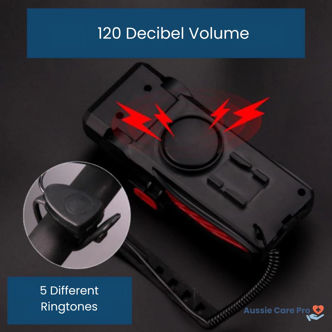 The bell reaches 120 decibels, making it significantly louder than standard bike bells. It also offers 5 selectable tones.