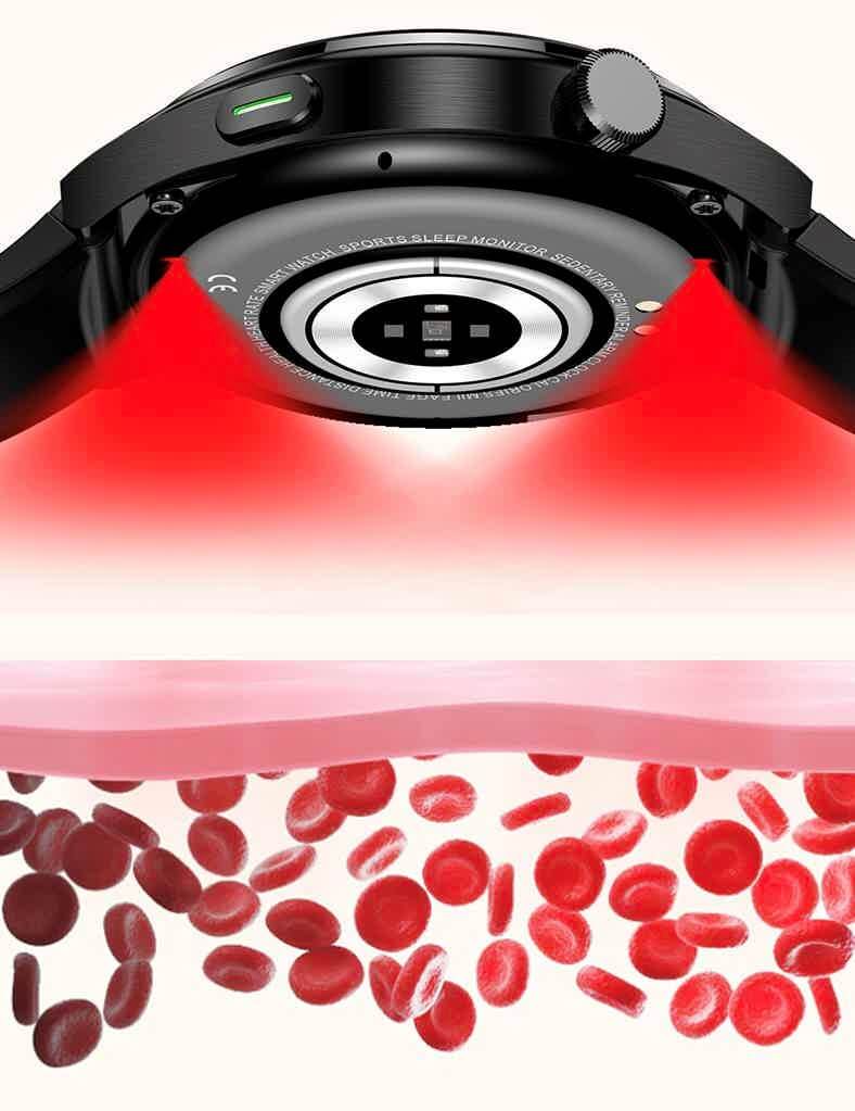 Our health watch measures blood pressure using an advanced optical sensor that detects blood flow beneath the skin, it employs a technique called"Photoplethysmography (PPG)". Which involves emitting light into the skin and measuring the changes in light absorption to calculate blood pressure. Our heart rate monitor watch provides a convenient, accurate and non-invasive way to track your blood pressure throughout the day.